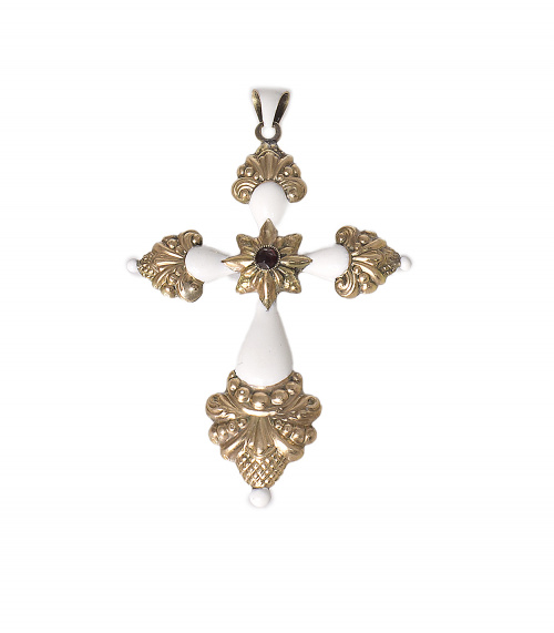 45. Cruz colgante S. XIX con esmalte blanco y brazos con volumen de formas gallonadas. Con anverso y reverso idénticos, adornados por granate central