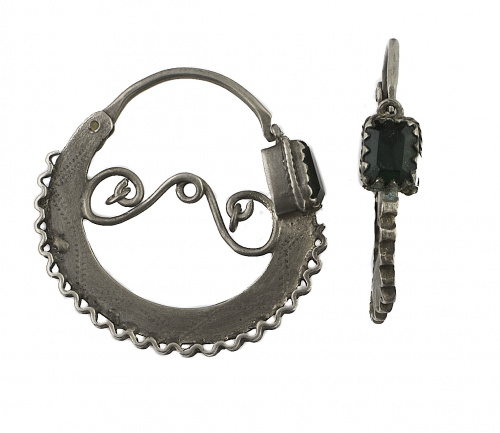 6. Arracadas leontinas con vidrio verde y dibujo grabado en plata s.XVIII-XIX
