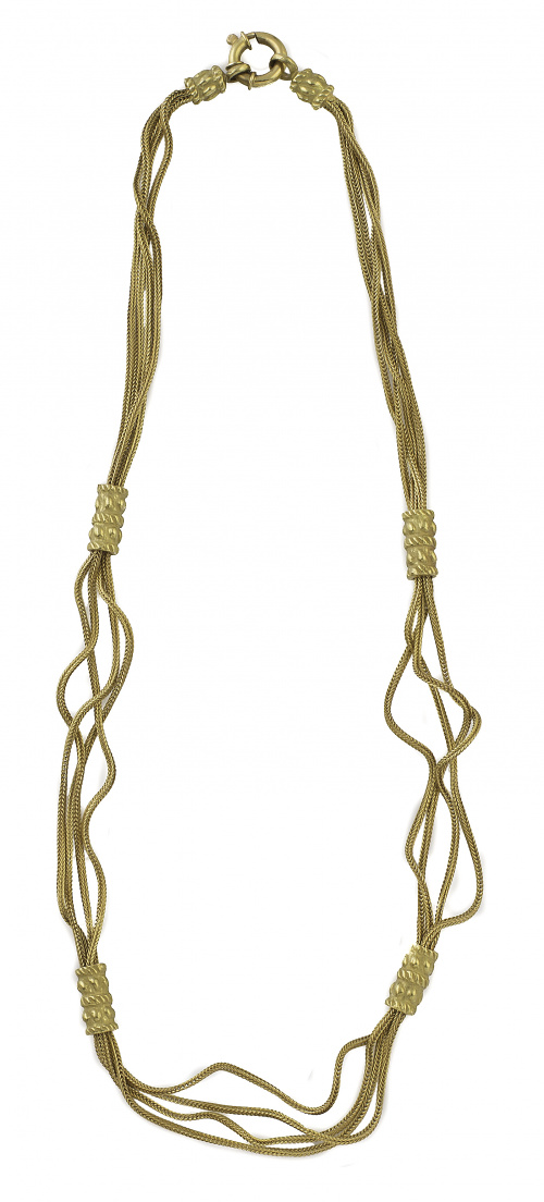 8. Collar portugués S. XIX de cuatro hilos de cordoncillo de oro amarillo mate de 19K, unidos en cuatro puntos por cilindros con decoración de cordoncillo y puntos en relieve