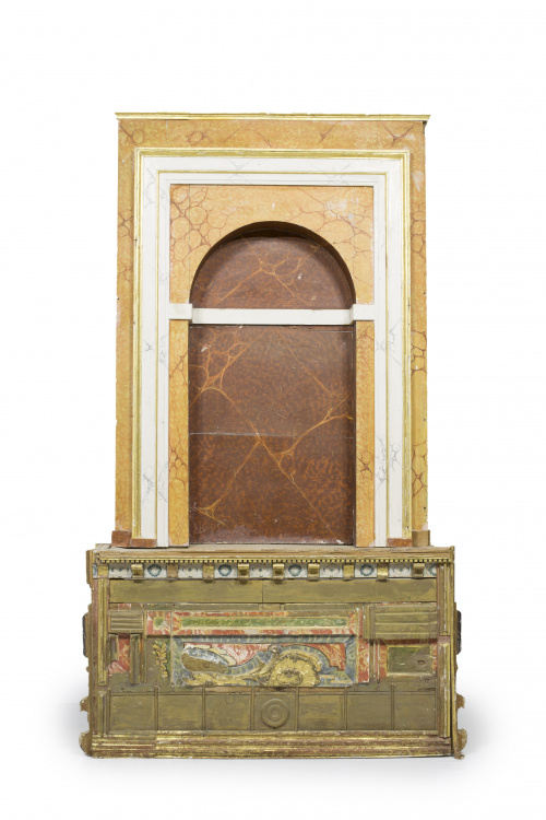 Mesa de altar y retablo neoclásico en madera tallada y marmorizada.Trabajo español, ffs. del S. XVIII - pp. del S. XIX..