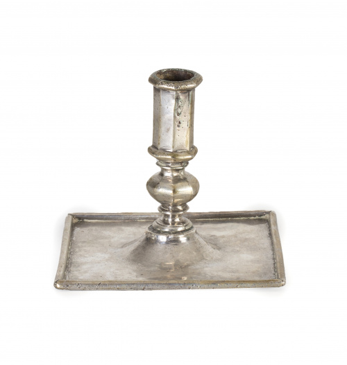 Candelero de plata de pie cuadrado y mechero torneado, Trabajo español, S. XVII - XVIII.