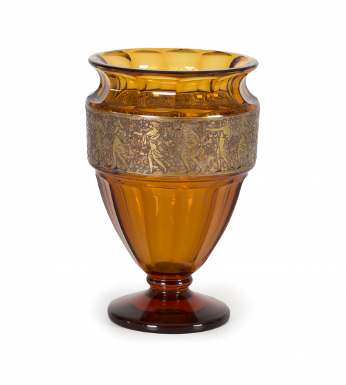 Jarrón de cristal color ámbar con cenefa dorada en relieve, decorada con guerreros. Móser, república Checa, primera mitad del S. XX..