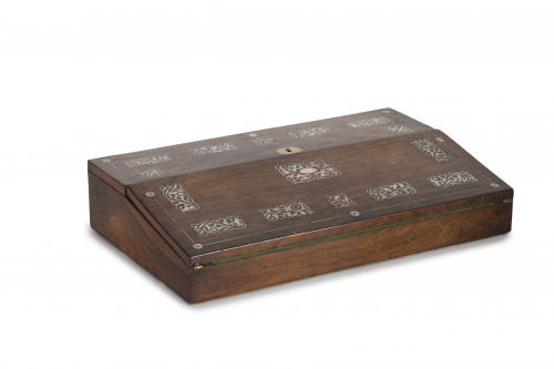 Escritorio de viaje de madera de palosanto y nácar.Trabajo inglés, S. XIX.