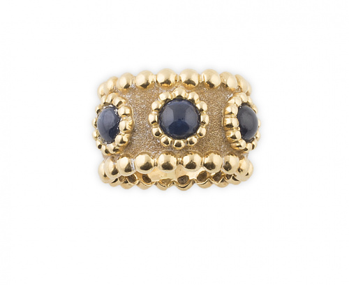 116. Sortija ancha con tres cabuchones de zafiros en montura con remate de bolitas