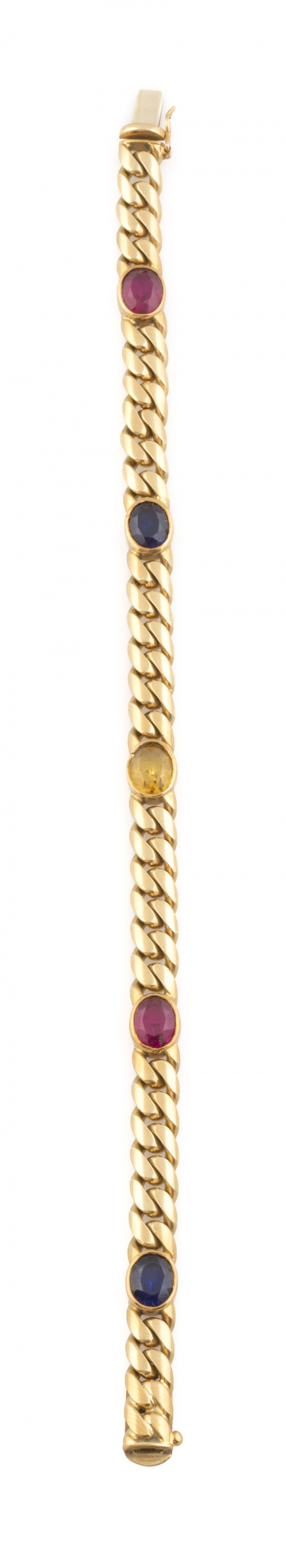 119. Pulsera de eslabón barbado en oro amarillo de 18K, con citrino central de talla oval y rubíes y zafiros sintéticos de talla oval