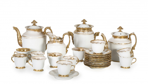 Está formado por: tetera, cafetera, azucarero, lechera, 11 tazas de té y 9 platos.