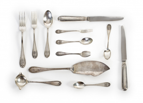 1237. Cubertería en plata con decoración de hojas cinceladas e iniciales.Masriera y Carreras, Barcelona, primera mitad del S. XX.