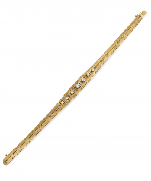 127. Brazalete con siete brillantes centrales alineados, en malla de barritas articuladas de oro amarillo de 18K