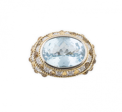 129. Sortija con topacio azul ovales en montura a modo de turbante, con tres niveles de cuarzos citrinos talla perilla y pavé de brillantesseparados por líneas de cordoncillo de oro