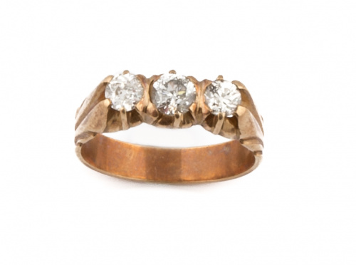 13. Sortija de pp. S.XX con tresillo de brillantes de talla antigua, en montura gallonada de oro rosa de 18K.