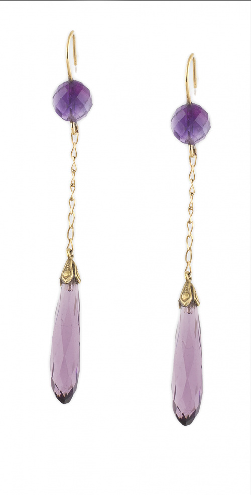 143. Pendientes largos con amatistas superior de la que penden cadena y vidrio morado talla brioellete