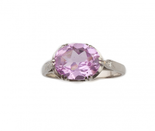 Sortija con rosa de Francia de talla oval flanqueada por brillantes en montura de platino