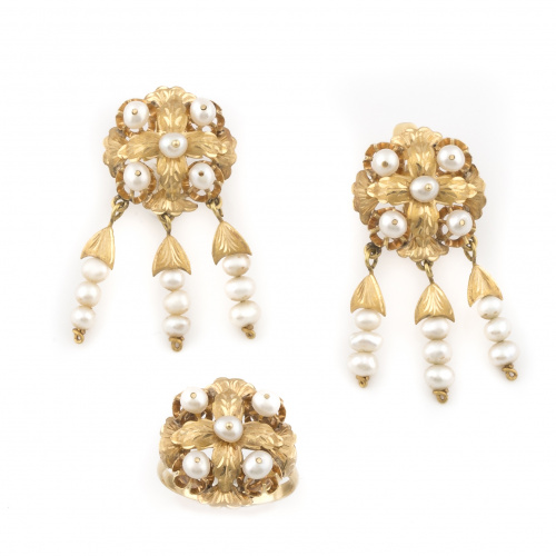 15. Conjunto de pendientes y sortija con flores de oro grabado en relieve y perlas de aljófar en centros y cascadas colgantes