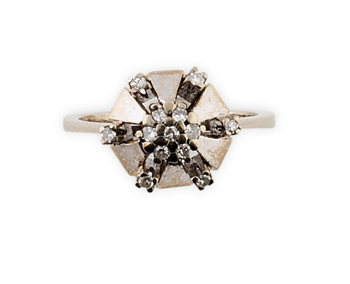 156. Sortija rosetón años 70 con brillantes en centro y marco en forma de estrella