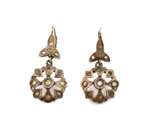 16. Pendientes de pp. S. XX con rosetón de zafiros blancos que penden de trébol