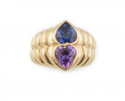 Sortija con corazones de rosa de Francia y zafiro sintético en doble aro unido de oro gallonado