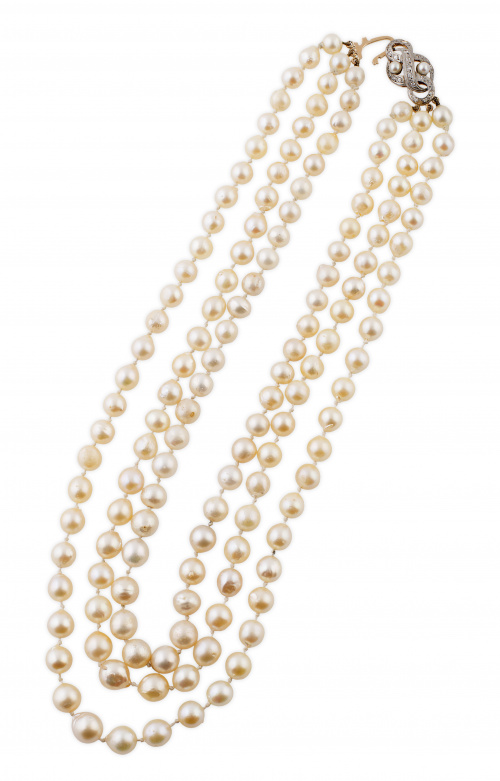 201. Collar de tres hilos de perlas cultivadas de tamaño graduado,con cierre de cintas entrelazadas con diamantes y perlas