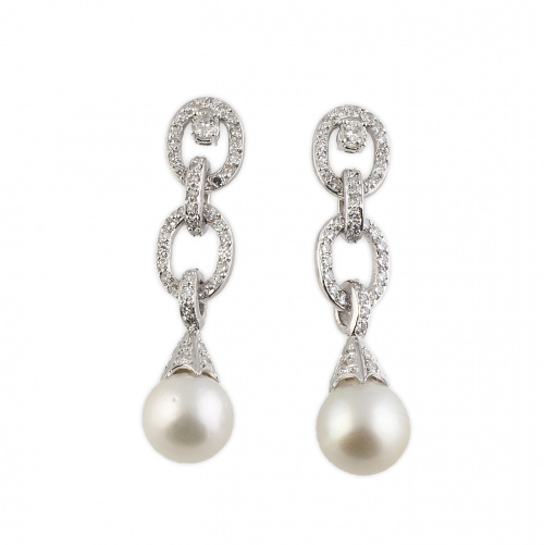 En oro blanco de 18K. Peso total aprox btes: 1,42 ct. Diámetro aprox perlas: 13 mm. Longitud: 5,7 cm.