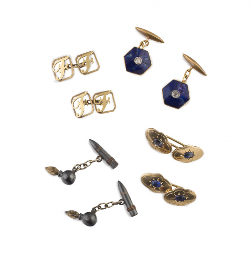 Unidas por sistema de cadena. En oro amarillo de 18K. Cada pieza: 0,8 x 0,7 cm.