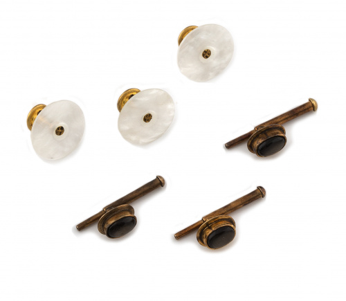 Lote formado por tres botones de frac en oro de 18K con cabuchones de labradorita, y tres botones de resina simulando nácar y metal dorado.