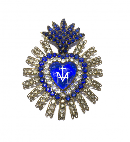 Pectoral Virgen con forma de corazón de metal y cristal trasparente y azul.Trabajo español, S. XVIII-XIX.