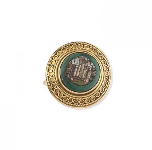 Sortija con micromosaico circular de piedras duras en marco de oro amarillo con decoración de filigrana