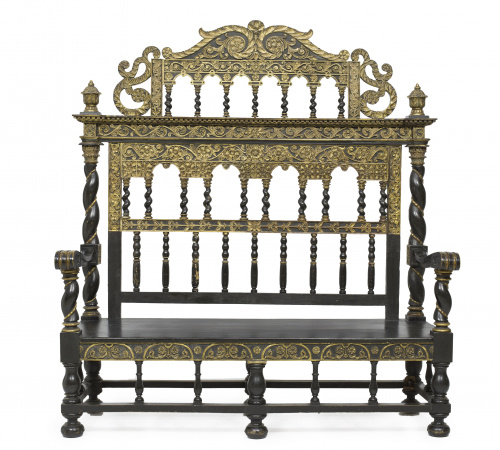 Cama convertida en banco en madera tallada ebonizada y dorada.Portugal, segunda mitad S. XVII y posterior..