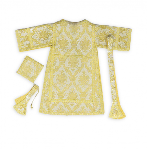 Medidas dalmática: 110 x 135 cm Dos dalmáticas con decoración de piñas, flores y coronas, libro de corporales, capa pluvial, manga procesional, casulla, cinco estolas y paño de cáliz.