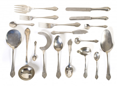 Peso sin cuchillos: 7,118 kgr. Con iniciales grabadas. Esta formada por: 18 cucharas soperas, 18 tenedores de carne, 18 cuchillos de carne, 12 tenedores pescado, 12 palas pescado, 12 tenedores marisco, 18 cuchillos de merienda o postre, 18 tenedores de merienda o postre, 18 cucharas de merienda o postre, 12 cucharas de café, 12 cucharas de helado, 10 cubiertos de servir, 4 cubiertos para servir marisco, 2 cucharas para espolvorear azúcar y un cazo para la salsa. Total: 185 piezas. *Malde joyería emblemática de Santiago de Compostela, durante 77 años.