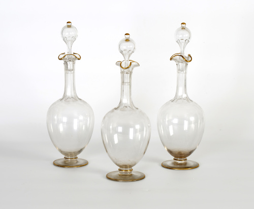 424. Tres decantadores de cristal transparente y oro.Posiblemente Baccarat, S. XIX.