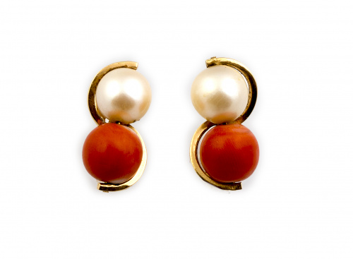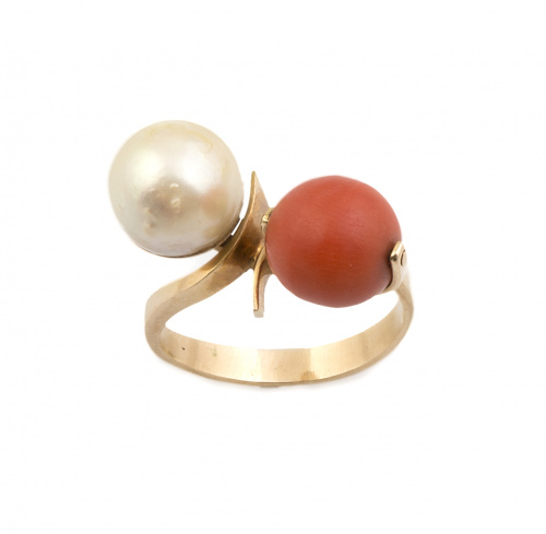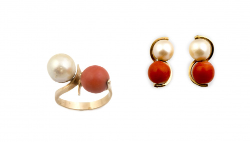 48. Conjunto de pendientes y sortija tú y yo con perla cultivada y cuenta de coral de 9 mm
