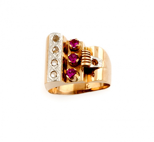 69. Sortija chevalière con diamantes y rubíes sintéticos en montura asimétrica de oro rosa de 18K.