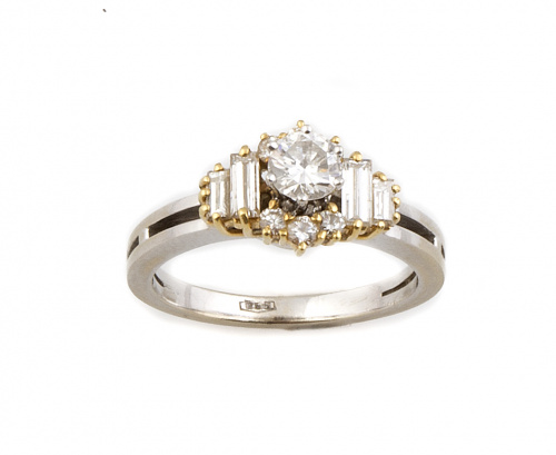 Sortija con un brillante central de 0,30 ct aprox entre bandas de baguettes y brillantes escalonadas