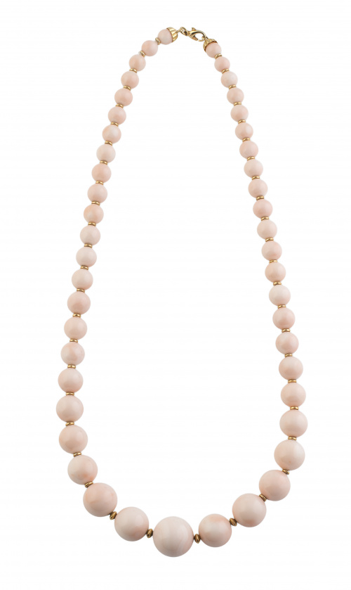 747. Collar de coral japonés piel de ángel de calidad extra con 47 cuentas en disminución, siendo la central de 17,7 mm