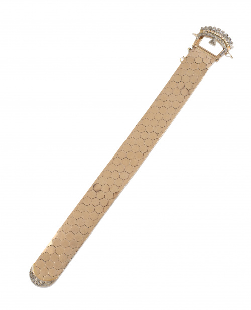92. Brazalete años 50 con diseño de cinturón de hexágonos articulados, con cierre en forma de corona con diamantes