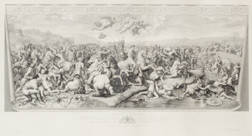 Grabado recortado adherido a otro soporte. 49,5 x 92 cm. Grabado que narra la batalla del Puente Milvio (312 d.C) en la que Majencio fue derrotado, representado a punto de ahogarse en el rio Tíber, que supuso la victoria del cristianismo sobre el mundo pagano. Al fondo a la izquierda, localizado el Monte Mario.