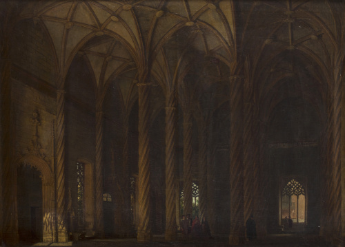 Óleo sobre lienzo. 71 x 98 cm. Con marco arquitectónico en madera tallada y dorada. Discípulo de Federico de Madrazo, y especializado en paisajes urbanos y vistas arquitectónicas, fue premiado en distintas Nacionales de Bellas Artes: mención honorífica en 1856, tercera medalla en 1858 y primera en 1860 y 1862. En la Exposición Universal de París de 1867 obtuvo tercera medalla, y en las de Viena (1873), Filadelfia (1876) y Múnich (1876) el máximo galardón. Respecto a la obra de su mano que ofrecemos, el Museo del Prado guarda una versión en mayor tamaño (144 x 198 cm.), expuesta en la Exposición Nacional de 1866 y “adquirida el 3 de mayo de 1867 en la cantidad de 1,000 escudos”; tras su compra, “su autor fue propuesto para la encomienda ordinaria de Carlos 3º”.