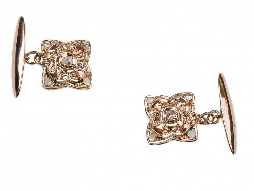 Gemelos S. XIX con pieza de flor cuadrangular calada con zafiros blancos y sistema de cadena y submarino