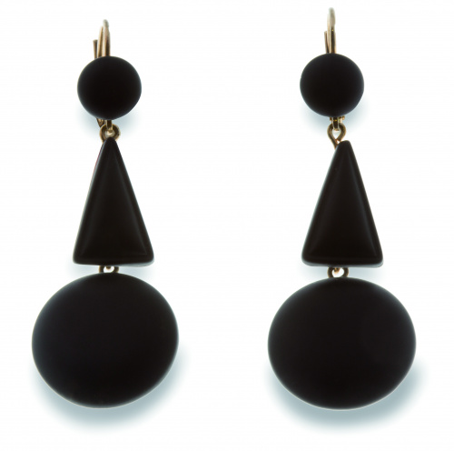 38. Pendientes largos de pp. S. XX con tres piezas de azabache en metal dorado