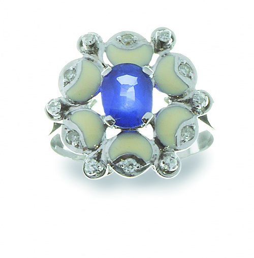 705. Sortija con diseño de flor con zafiro central y pétalos de esmalte color marfil con brillantes