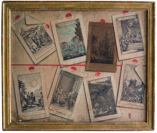 875. ESCUELA ITALIANA, SIGLO XVIIITrampantojo con grabados de: “Battesimo del Re del Congo”, “Circoncisione del Rey Bantam”, “Picedi bastimenti indiani in uso sulla costa de Malabar”, “Ilre di conchin sul suo elefante accompagnado da i fuoi Nairi”, “Udienza d.