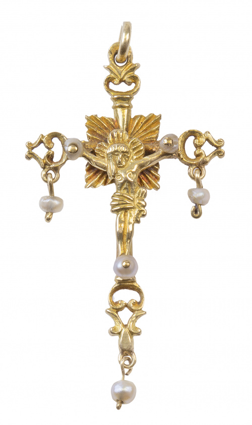 2. Crucifijo colgante S. XVIII-XIX con brazos rematados con formas caladas y perlas de aljófar colgantes