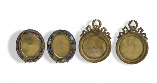 Juego de dos marcos Napoleón III de bronce dorado de estilo Luis XVI, Francia, ffs. del S. XIX y dos marcos en micromosico, Italia S. XIX.