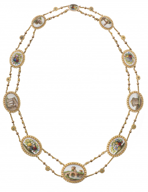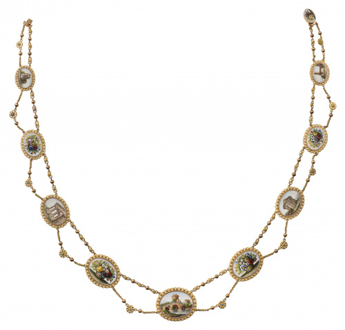 78. Collar c.1800 de oro y micromosáico romano en medallones de tamaño creciente que representan en motivos alternos bodegones florales y monumentos clásicos en entornos de paisaje