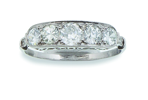 Sortija cintillo de pp. S. XX con cinco brillantes engastados en banda arqueada con galería lateral calada