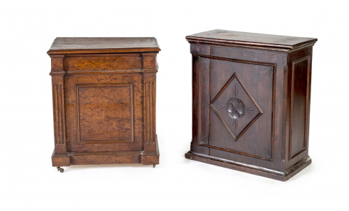 Conjunto de dos mesillas en madera de pino y raíz de nogal con tapa abatibleEspaña pp. del S. XX.