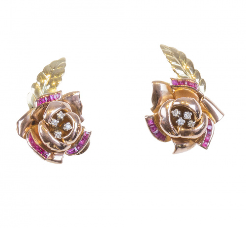 570. Pendientes años 40 con diseño de rosas de brillantes y rubíes