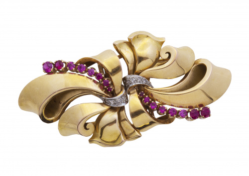 Home / Subasta 9 y 10 de octubre de 2019 / Broche lazo doble clip años 40 con rubíes sintéticos y bril