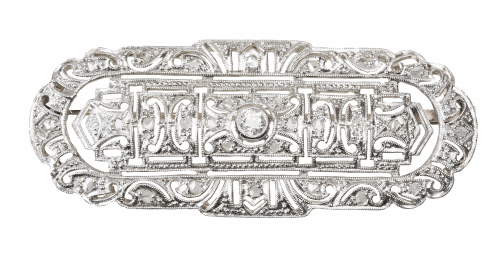 582. Broche placa Art-Decó de diamantes con diseño geométrico calado y brillante en chatón central