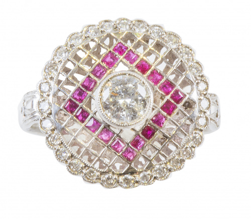 El centro, inscrito en un rombo formado por rubíes de talla carré, y con orla exterior de chatones de brillantes. Los brazos de la montura adornados por una hojita con brillante. En platino. Peso total aprox btes: 0,60 ct.